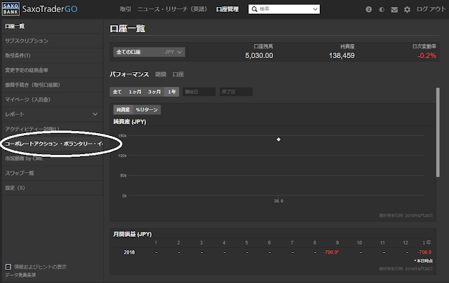 SaxoTraderGoにログインし、「口座管理」→「コーポレートアクション・ボランタリー・・・」を選択。(スマホアプリのSaxoTraderGoではできないようです。)
