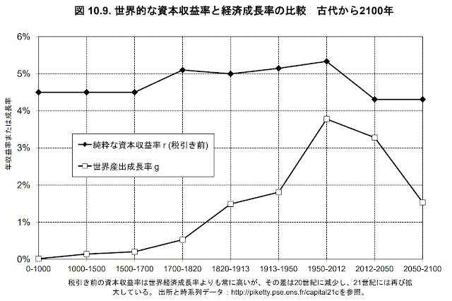 今後、世界経済成長が鈍化していくのは確実ですが、ピケティの「21世紀の資本」によると、資本収益率rは世界経済成長率gの水準にかかわらず安定して4〜5%程度で推移してきました。